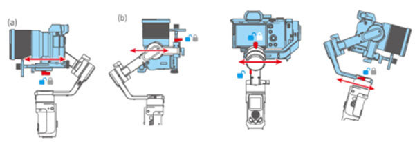 Balance:Step by step to adjust vertical and horizontal direction of tilt axis, roll axis and pan axis. The standard of balance: camera can stay there without holding by hand ,no matter where you point it to (tilt axis should be perfectly balanced).