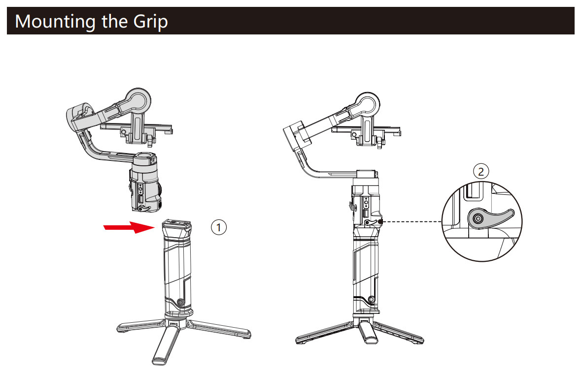 - Loosen the Knob on the pan motor①. Adjust the camera balance② until the camera is steady when rotating the pan while lifting the grip.