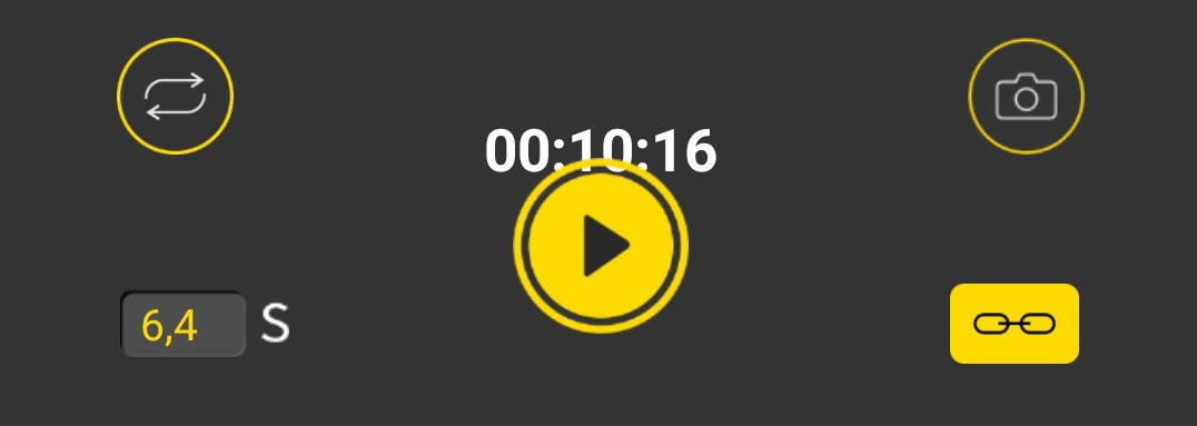 in the top left we can see two customizable options, and one informative icon. First customizable option is the exposure button, where you can apply the time of exposure you want to make, in front we have a ? icon, that explain the exposure. Above of it, we have the Interval button, were you can chose the interval you want to make of wich photo, as the exposure button, we have a ? icon that explain the interval mode.
